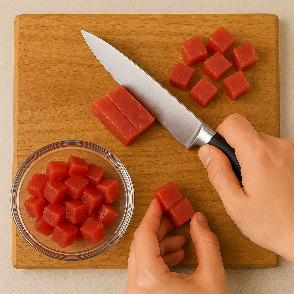 Slice, don’t mash – Use a sharp knife to cleanly dice tuna; avoid tearing or smashing the meat.